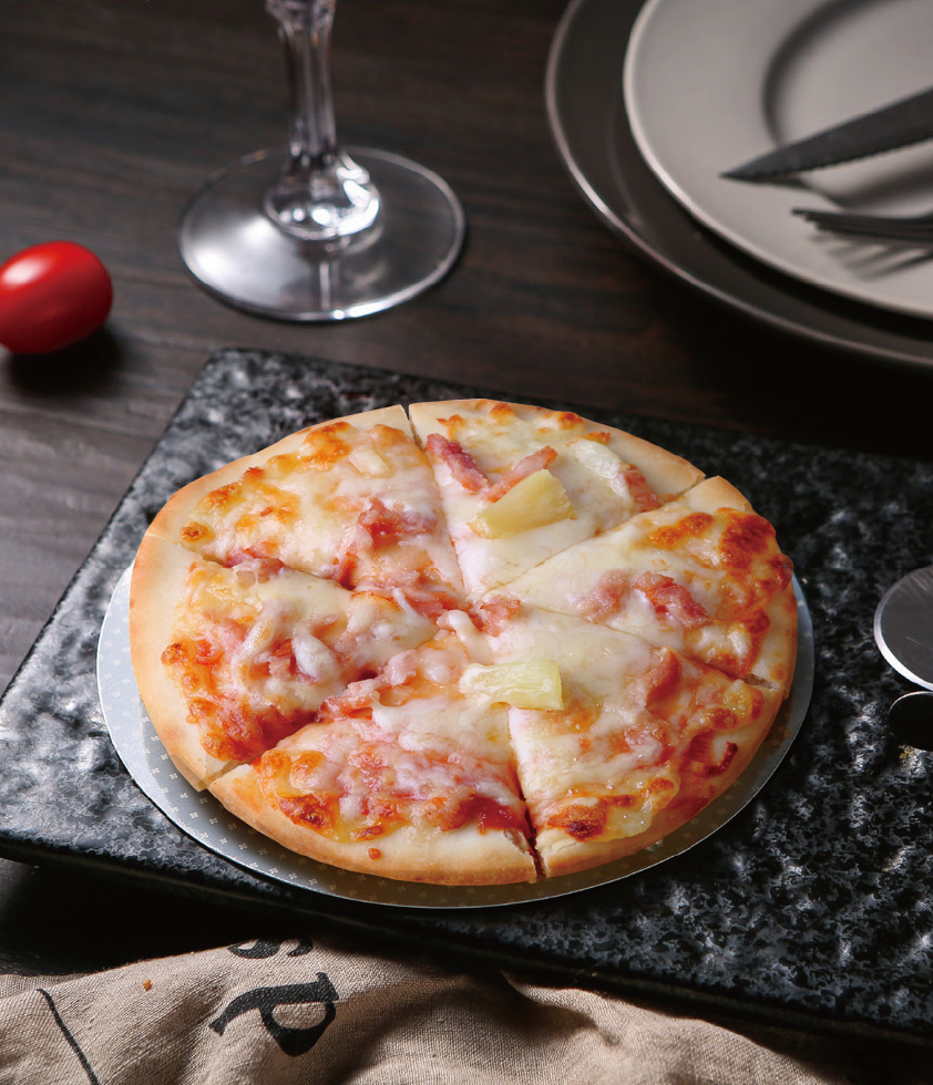 產(chǎn)品介紹:夏威夷風(fēng)情匹薩——酸酸甜甜、清爽可口的菠蘿,和熏制入味、肥瘦得當(dāng)?shù)呐喔?,在乳酪香濃的味道的襯托下,演繹出了這款經(jīng)典口味的匹薩。