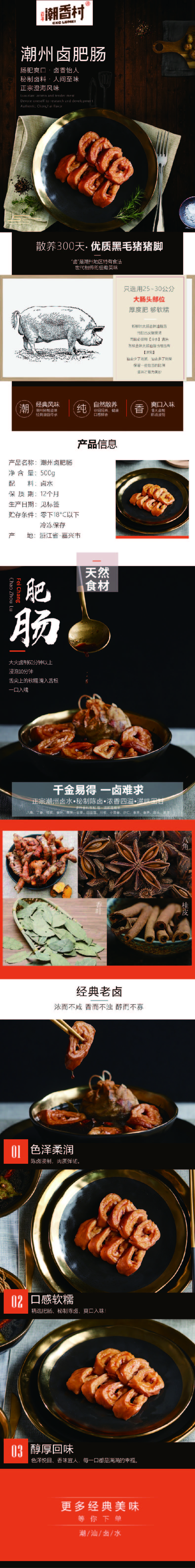 產(chǎn)品介紹:潮州鹵肥腸——九轉(zhuǎn)十八彎中的人間至味。潮香村只選用大腸頭部位置的25~30公分入料,因?yàn)樗穸确?,夠軟糯,乃肥腸爽口,鹵香味怡人! 工藝:陳鹵鹵制 規(guī)格(g):500g 包裝規(guī)格:500g/袋 箱規(guī):無(wú)